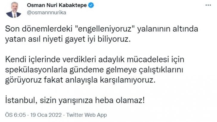 İSTANBUL (İHA) – AK Parti İstanbul İl Başkanı Osman Nuri Kabaktepe, “Spekülasyonlarla gündemde kalmaya çalışan CHP’li İBB Başkanı; ne seçim vaatleri gerçekleştirmiş ne de 2,5 yılda bir tane eser ve hizmet üretmiştir. Şimdi en iyi bildiği işe sarılmış; ‘Engelleniyoruz bahanesi’” dedi.