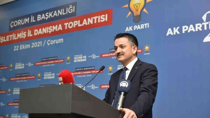 Tarım ve Orman Bakanı Dr. Bekir Pakdemirli, AK Parti Çorum İl Başkanlığı tarafından düzenlenen İl Danışma Meclisi toplantısına katıldı. Bakan Pakdemirli, burada gündeme ilişkin açıklamalarda bulundu. Türkiye’nin Cumhurbaşkanı Recep Tayyip Erdoğan ve AK Parti sayesinde tarımda, savunmada, sanayide, eğitimde çağ atladığını dile getiren Bakan Pakdemirli, “Biz iktidar olarak çalışıyoruz. Bizim başımızda Recep Tayyip Erdoğan gibi bir lider var. Bugün pandemi, iklim değişikliği, orman yangınları, enerji yetersizliği gibi birçok küresel sorunumuz var. Bütün dünya bu sorunlardan payını aldı ve payını almaya devam ediyor. Hem hükümet olarak hem de bakanlık olarak pandemi de bu sorunlara karşı birçok tedbir aldık ve almaya devam ediyoruz. Su kıtlığı dünyanın problemi. Bununla ilgili şura yaptık. Gıda kıtlığı dünyanın problemi bununla ilgili çalışma yaptık. Bunla ile ilgili dünyada zaiyat var. Dünyada üretilen her 3 üründen bir tanesi çöpe gidiyor. Ülkede refahın artmasıyla birlikte maalesef Türkiye’de de böyle bir zaiyat söz konusu. Ciddi bir kampanya yürüterek bir yılda 700 milyon lira tasarruf sağladık. Orman yangınları dünyanın dört bir yanını sardı. Amerika’da halen yangınlar devam ediyor. Geçtiğimiz haftalarda ABD büyükelçisi ziyaretimize geldi. Yangınların devam ettiğini önemli bir bölümünü söndüremediklerini ifade etti. Sizden bilgi paylaşımına ihtiyacımız var. Ülkemiz her zaman gururlu ülkeydi. 80’li yıllarda unutmuyorum. İngiltere gelir bize futbolda 8 tane gol atardı. Biz omzumuzu silkelerdik. Cumhurbaşkanımız Recep Tayyip Erdoğan’ın sayesinde Türkiye şimdi her alanda dünyanın en büyük yatırımlarına imza atan ülke oldu” diye konuştu.