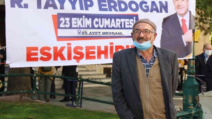 Eskişehir’e yaklaşık 100 kilometre uzaklıktaki Sivrihisar’dan gelen ve çiftçilik yapan Hüseyin Çetin isimli 71 yaşındaki yaşlı adam ise, Cumhurbaşkanı Erdoğan’ın 1 haftadan bu yana beklediğini dile getirdi. Erdoğan’ın çok sevdiğini belirten Çetin, “Ben Cumhurbaşkanımızı neredeyse 1 haftadır bekliyorum. Onun için çok sevinçliyim. Bir kardeşim gibi bekliyorum onu. İmkânım olsa yanına gidip kucaklayacağım. İçimde böyle bir sevinç var. İnşallah orada bir görevli beni yanına götürür. Bacağımda bir sakatlık var o yüzden fazla kalabalığa girmek istemiyorum, ama beni yanına alsa gider kucaklarım. Taksi tuttum geldim buraya onu görmek için. Vatanımıza milletimize hizmet eden bir insan. Biz görüyoruz” dedi.