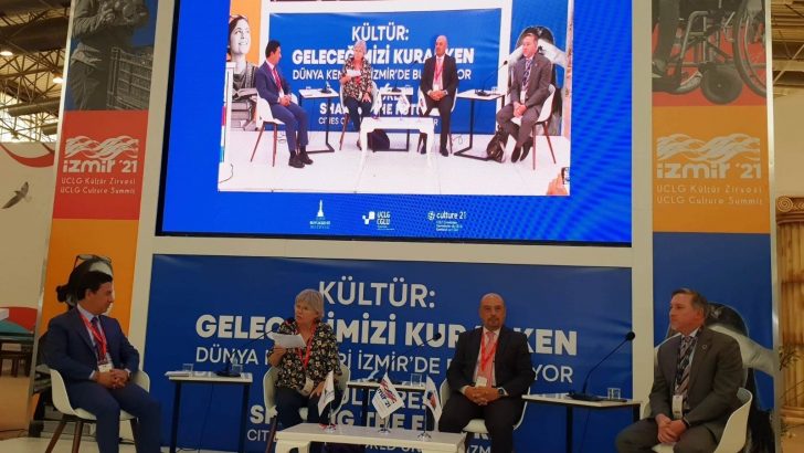 İzmir’in Rusya’nın Kazan ve Meksika’nın Merida kentlerini geride bırakarak ev sahipliği yapmaya hak kazandığı Dünya Belediyeler Birliği (UCLG) Kültür Zirvesi’nin açılışı 9 Eylül Perşembe günü İzmir Kültürpark’ta yapıldı. 9-11 Eylül tarihleri arasında üç gün sürecek ve “Kültür: Geleceğimizi Kurarken” temasıyla düzenlenen zirvede, 65 ülkeden kültür üreticileri buluşacak. 346’sı çevrim içi olmak üzere toplam 864 konuşmacı görüşlerini paylaşacak.