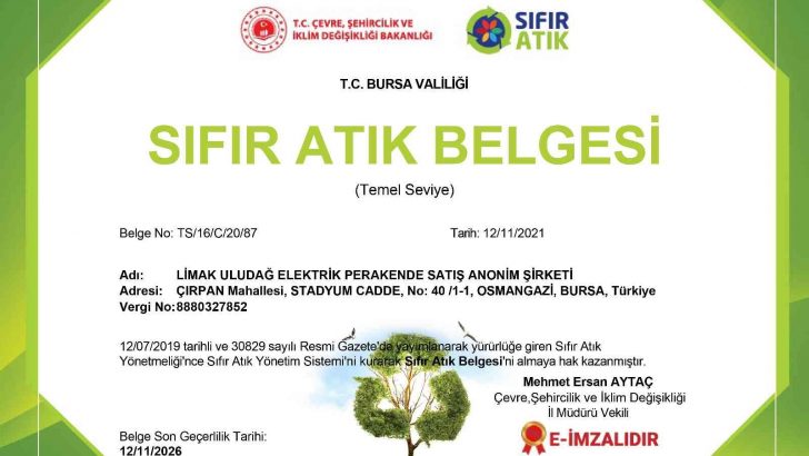 Bursa, Balıkesir, Çanakkale ve Yalova’da 5 milyon kişiye hizmet veren Limak Enerji Uludağ Elektrik, sürdürülebilirlik politikası doğrultusunda geliştirdiği çalışma ve projeler kapsamında atıkların işlenmesine ilişkin eğitimlerini tamamlayarak Çevre, Şehircilik ve İklim Değişikliği Bakanlığı tarafından Sıfır Atık Belgesi almaya hak kazandı.