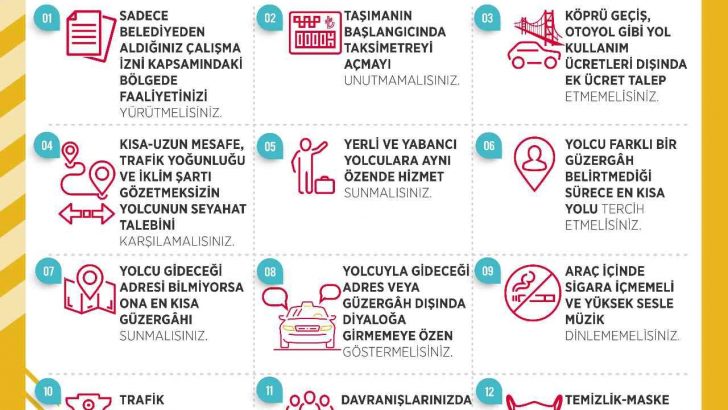 “Sadece belediyelerden aldığınız çalışma izni kapsamında bölge faaliyetinizi yürütmelisiniz. Taşımanın başlangıcında taksimetreyi açmayı unutmamalısınız. Köprü geçiş, otoyol gibi kullanım ücretleri dışında ek ücret talep etmemelisiniz. Kısa-uzun mesafe, trafik yoğunluğu ve iklim şartı gözetmeksizin yolcunun seyahat talebini karşılamalısınız. Yerli ve yabancı yolculara aynı özende hizmet sunmalısınız. Yolcu farklı bir güzergah belirtmediği sürece en kısa yolu tercih etmelisiniz. Yolcu gideceği adresi bilmiyorsa ona en kısa güzergahı sunmalısınız. Yolcuyla gideceği adres veya güzergah dışında diyaloğa girmemeye özen göstermelisiniz. Araç içinde sigara içmemeli ve yüksek sesle müzik dinlememelisiniz. Trafik kurallarına uymalı, emniyet kemerinizi mutlaka takmalısınız. Davranışlarınızda kamunun huzurunu gözetmelisiniz. Temizlik-maske-mesafe kurallarına uymalı, aracınızı temiz tutmalısınız. Aksi şekilde davranan şoförlerle ilgili yapılan ihbarların, Kabahatler Kanunu ve Karayolları Trafik Kanunu kapsamında değerlendirileceğini; çalışma izin belgenizin süreli veya daimi iptal edilebileceğini unutmayınız.”