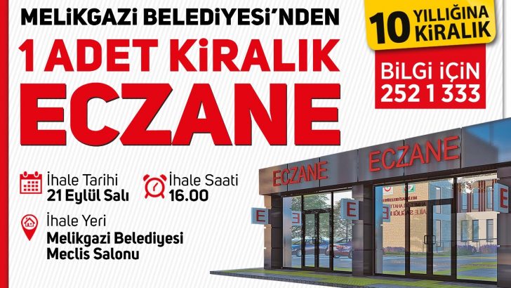 MÜLKİYETİ MELİKGAZİ BELEDİYESİ’NE AİT OLAN 1 ADET ECZANE 21 EYLÜL SALI GÜNÜ AÇIK ARTIRMA USULÜYLE 10 YILLIĞINA KİRAYA VERİLECEK.