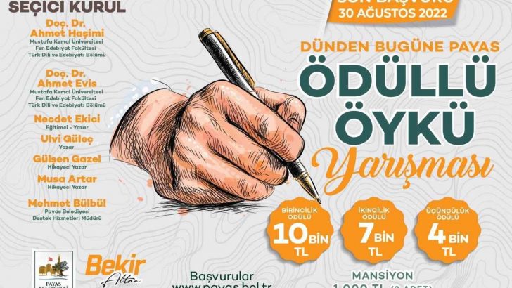 Tarihi ve doğal güzellikleri içinde Payas’ı tanımak, tanıtmak; folklorik zenginlik, taşıdığı kültürel ögeler ve tarih içinde Payas’ı edebiyat aracılığı ile yeniden yorumlamak isteyenlerin başvuracağı öykü yarışmasında birinciye 10 bin lira, ikinciye 7 bin lira, üçüncüye 4 bin lira ödül verilecek.