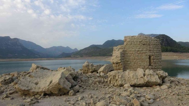 Adana’da Kozan ilçesindeki baraj gölünde kurak yaz mevsiminin ardından suların iyice çekilmesi sonucu Bizans ve Roma dönemine ait kilise ve tarihi yapılar ortaya çıktı.