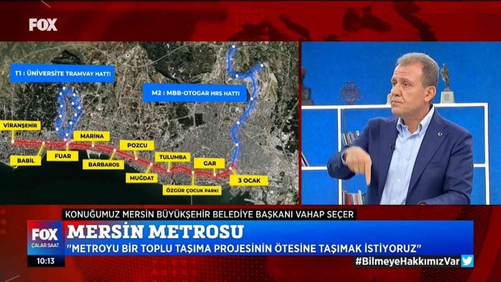 “Mersin çok kozmopolit bir yer. Mersin, Türkiye’nin özeti. Merkezde 4 ilçe var. 4 merkez ilçede sosyokültürel, sosyoekonomik yapı çok farklı. Şimdi yaptığımız 34,4 kilometrelik bir raylı sistem. İlk etapta 13,4 kilometre yeraltından geleceğiz. Doğu-batı aksından yeraltı metrosu. Zaten bize en çok maliyet getirecek olan bu proje. Sonra ikinci etapta Mersin Üniversitesi, Mersin Üniversitesi Hastanesi, o bölge çok hızlı gelişiyor. Orada da 8,4 kilometrelik bir tramvay hattı, bir ring düşünüyoruz. Yine metroya bağlayacağız. Şu anda ilk etapta, birinci etabın doğu noktasında, Tren Garının olduğu, eski otogarın olduğu bölgeden de Şehir Hastanesine ve yeni otogara çıkacağız.”